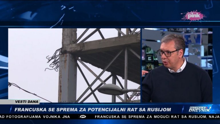 - Srbija mora da nastavi da oprema vojsku i da je snaži. Pametno smo se naoružavali. Moramo da uradimo sve da možemo da čuvamo svoj narod i zemlju od svakog potencijalnog agresora - rekao je Vučić gostujući na TV Pink, odgovarajući na pitanje u vezi sa izjavom načelnika Generalštaba francuskih oružanih snaga da je u toku priprema francuskih pripadnika oružanih snaga za mogući rat sa Rusijom u roku od tri ili četiri godine.