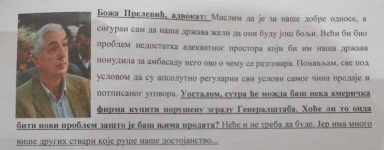 - Mislim da je za naše dobre odnose, a siguran sam da naša država želi da oni budu još bolji. Veći bi bio problem nedostatka adekvatnog prostora koji bi im naša država ponudila za ambasadu nego ovo o čemu se razgovara. Ponavljam, sve pod uslovom da su apsolutno regularni svi uslovi samog čina prodaje i potpisanog ugovora. Uostalom, sutra će možda baš neka američka firma kupiti porušenu zgradu Generalštaba. Hoće li to onda biti novi problem zašto je baš njima prodata? Neće i ne treba da bude. Jer ima mnogo više drugih stvari koje ruše naše dostojanstvo - rekao je Prelević.