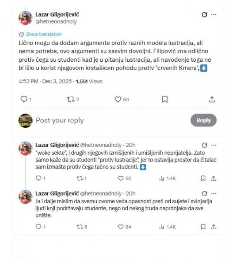 - Filipović zna odlično protiv čega su studenti kad je u pitanju lustracija, ali navođenje toga ne bi išlo u korist njegovom krstaškom pohodu protiv "crvenih Kmera". Zato samo kaže da su studenti "protiv lustracije", jer to ostavlja prostor da čitalac sam izmašta protiv čega tačno su studenti. Ja i dalje mislim da svemu ovome veća opasnost preti od sujete i svinjarija ljudi koji podržavaju studente, nego od nekog truda naprednjaka da sve unište - objavio je Gligorijević na mreži X.