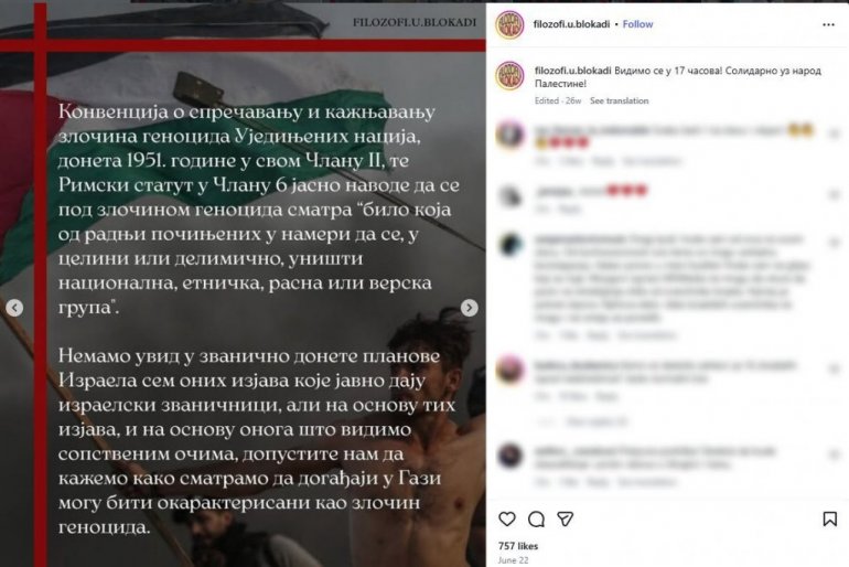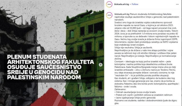 Cionizam – ideologija na kojoj počiva izraelski režim – jeste kolonijalna i nasilna politika koja desetlećima uništava živote Palestinaca. Kada Skupština Beograda menja imena ulica po želji izraelske ambasade – ulicu u Zemunu naziva po Teodoru Herclu, ocu ideje stvaranja jevrejske države i osnivaču cionizma, to nije „neutralan čin“ – to je politička poruka podrške okupaciji. ... Kao i mnoge generacije pre nas, znamo da je borba za slobodnu Palestinu deo šire borbe protiv kolonijalizma, aparthejda i fašizma – ovde i svuda. Zahtevamo: Prekid svih vojnih i političkih odnosa sa izraelskim režimom. Jasno izražavanje Srbije protiv genocida. Pozivamo sve studente, radnike i slobodnomisleće ljude da dignu glas.