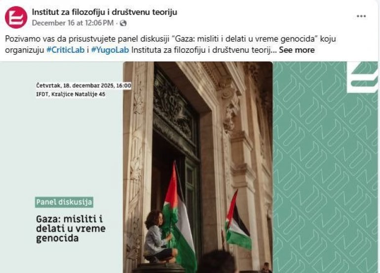Pozivamo vas da prisustvujete panel diskusiji „Gaza: misliti i delati u vreme genocida“ koju organizuju CriticLab i Yugolab Instituta za filozofiju i društvenu teoriju. Diskusija je posvećena genocidu u Gazi i ulozi akademske zajednice u suočavanju sa ovim nasiljem.