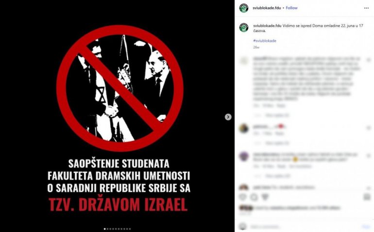 I Saopštenje studenata u blokadi Fakulteta dramskih umetnosti o saradnji republike Srbije sa TZV. DRŽAVOM IZRAEL