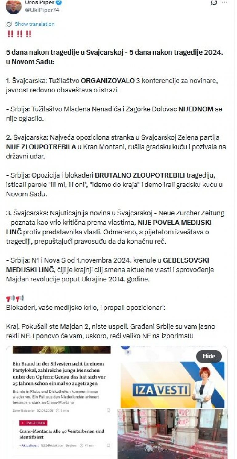 NOVINAR Uroš Piper na svom profilu na mreži "Iks" povukao je paralelu između tragičnog događaja u Švajcarskoj i u Srbiji.