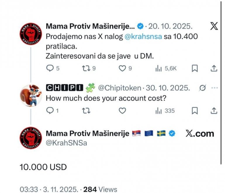 NA profilu na društvenoj mreži X nazvanom "Mama protiv mašinerije" objavljeno je da se stavlja na prodaju.