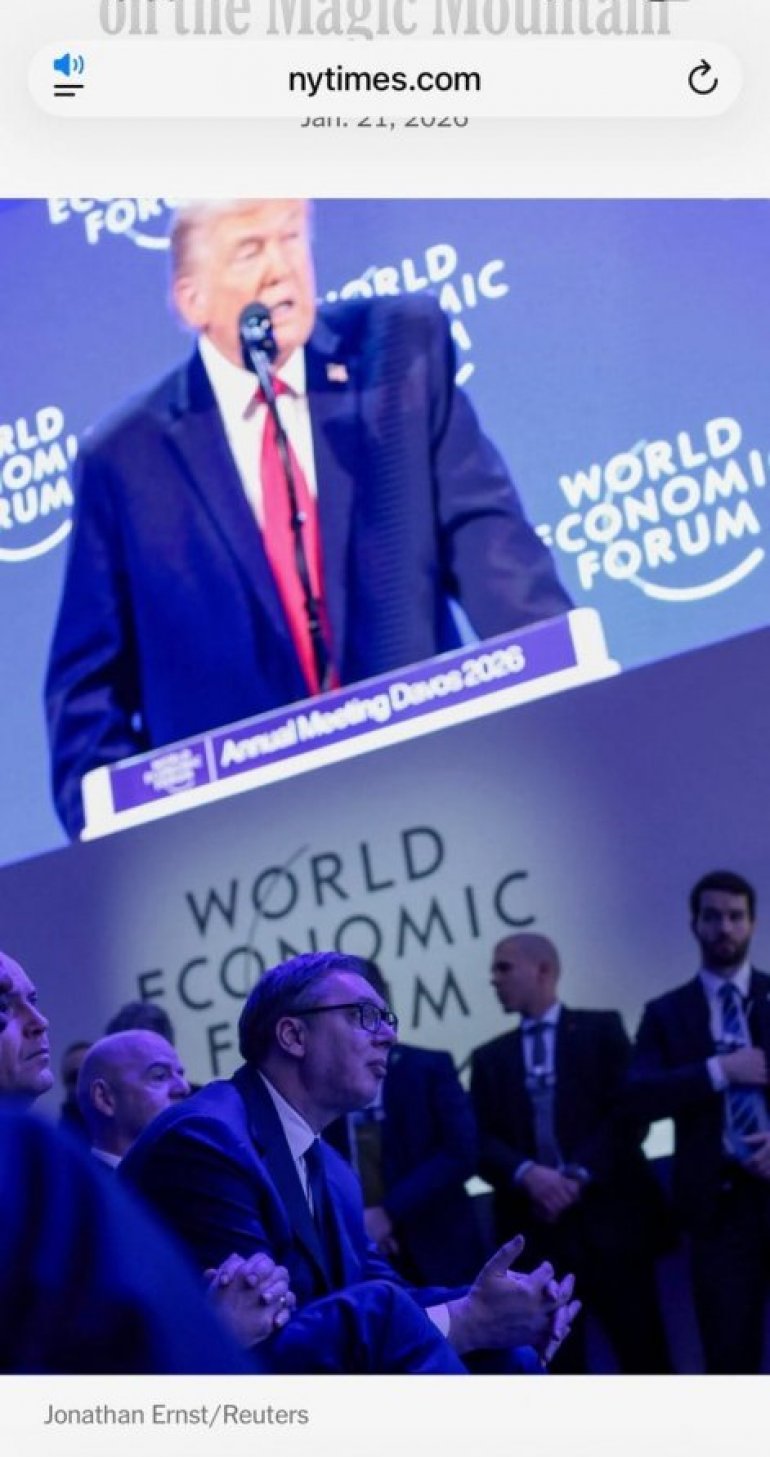 U prilogu Njujorka Tajmsa sa Svetskog ekonomskog foruma u Davosu objavljena je i fotografija na kojoj se vidi predsednik Srbije Aleksandar Vučić kako sa punom pažnjom, iz prvog reda, sluša obraćanje Donalda Trampa, jednog od najuticajnijih lidera današnjice.