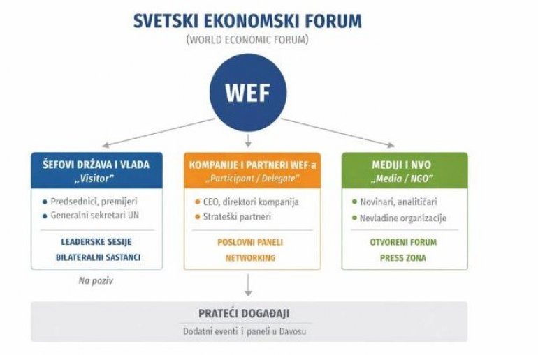"Učesnik/delegat" piše na bedževima koje nose predstavnici i direktori velikih kompanija, što je i normalno na Svetskom ekonomskom forumu. Na kraju, mediji i NVO imaju zasebne bedževe.