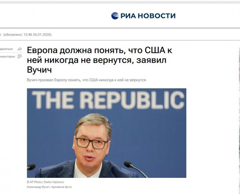 IZJAVA predsednika Srbije Aleksandra Vučića, u kojoj upozorava da Evropska unija mora da se suoči sa činjenicom da se Sjedinjene Američke Države nikada neće vratiti starom modelu odnosa sa Evropom, objavljena je kao udarna vest na naslovnoj strani svetskog izdanja ruskog portala Sputnjik, kao i na ruskoj agenciji RIA Novosti.