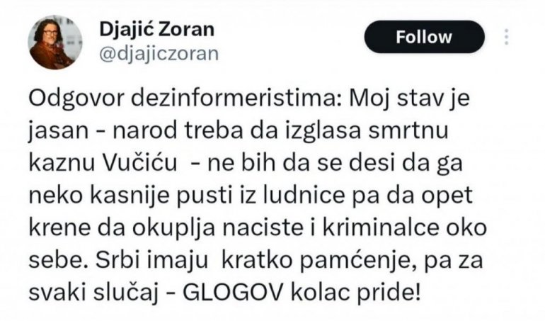 - Odgovor dezinformeristima: Moj stav je jasan - narod treba da izglasa smrtnu kaznu Vučiću - ne bih da se desi da ga neko kasnije pusti iz ludnice pa da opet krene da okuplja naciste i kriminalce oko sebe. Srbi imaju kratko pamćenje, pa za svaki slučaj - GLOGOV kolac pride!" - pisao je Đajić ranije na društvenoj mreži Iks.