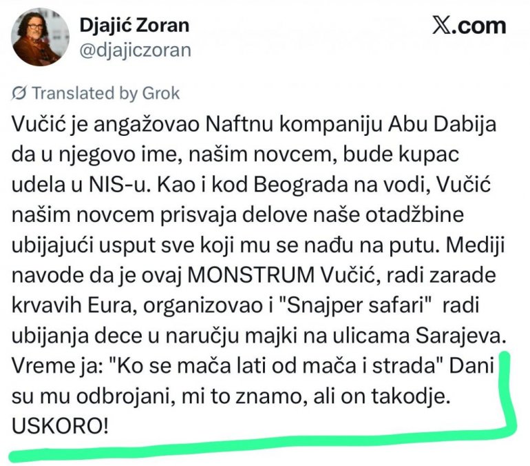 - Vučić je angažovao Naftnu kompaniju Abu Dabija da u njegovo ime, našim novcem, bude kupac udela u NIS-u. Kao i kod Beograda na vodi, Vučić našim novcem prisvaja delove naše otadžbine ubijajući usput sve koji mu se nađu na putu. Mediji navode da je ovaj MONSTRUM Vučić, radi zarade krvavih Eura, organizovao i "Snajper Safari" radi ubijanja dece u naručju majki na ulicama Sarajeva. Vreme ja: "Ko se mača lati od mača i strada" Dani su mu odbrojani, mi to znamo, ali on takođe. USKORO!