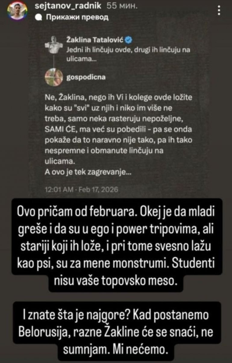 "Ovo pričam od februara. Okej je da mladi greše i da su u ego tripovima, ali stariji koji ih lože, i pri tome svesno lažu kao psi, su za mene monstrumi. Studenti nisu vaše topovsko meso.
