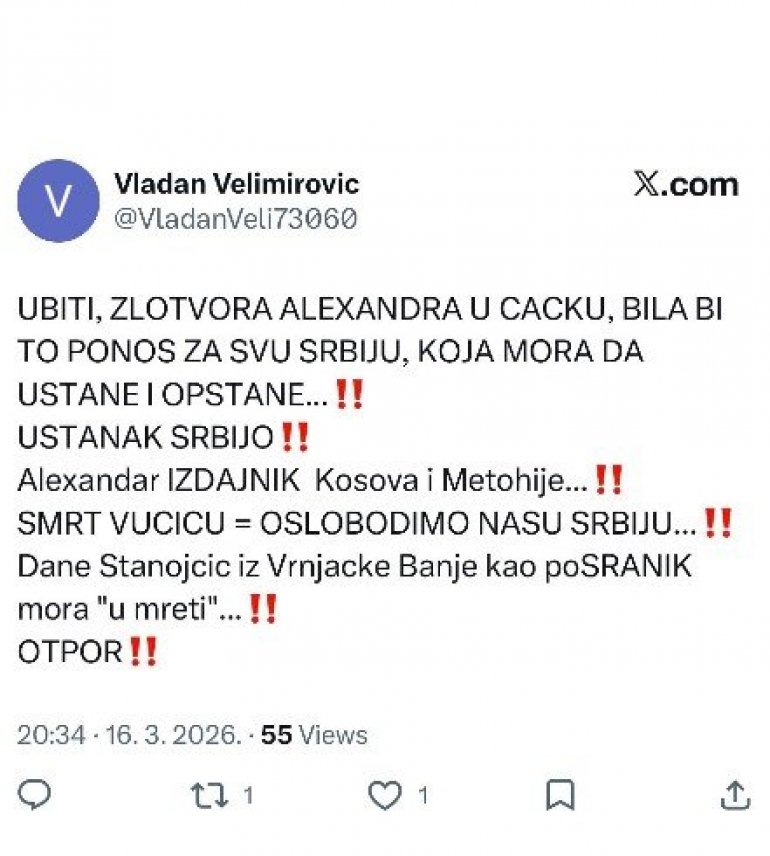 ''Ubiti zlotvora Aleksandra u Čačku, bio bi to ponos za svu Srbiju, koja mora da ustane i opstane. Ustanak, Srbijo. Aleksandar izdajnik Kosova i Metohije. Smrt Vučiću, oslobodimo našu Srbiju. Dane Stanojčić iz Vrnjačke Banje kao poSRANIK mora "umreti"'.
