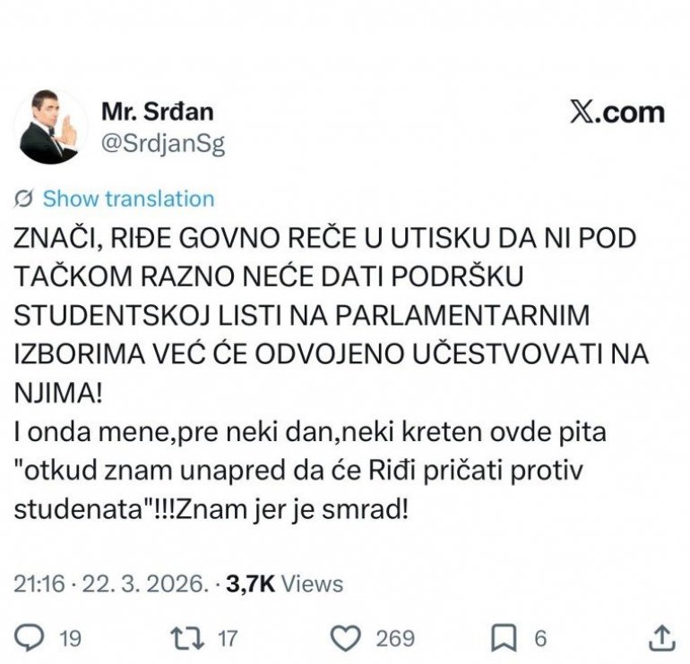 "ZNAČI, RIĐE GOVNO REČE U UTISKU DA NI POD TAČKOM RAZNO NEĆE DATI PODRŠKU STUDENTSKOJ LISTI NA PARLAMENTARNIM IZBORIMA VEĆ ĆE ODVOJENO UČESTVOVATI NA NjIMA! I onda mene,pre neki dan,neki kreten ovde pita "otkud znam unapred da će Riđi pričati protiv studenata"!!!Znam jer je smrad!" napisao je jedan blokaderski tviteraš.