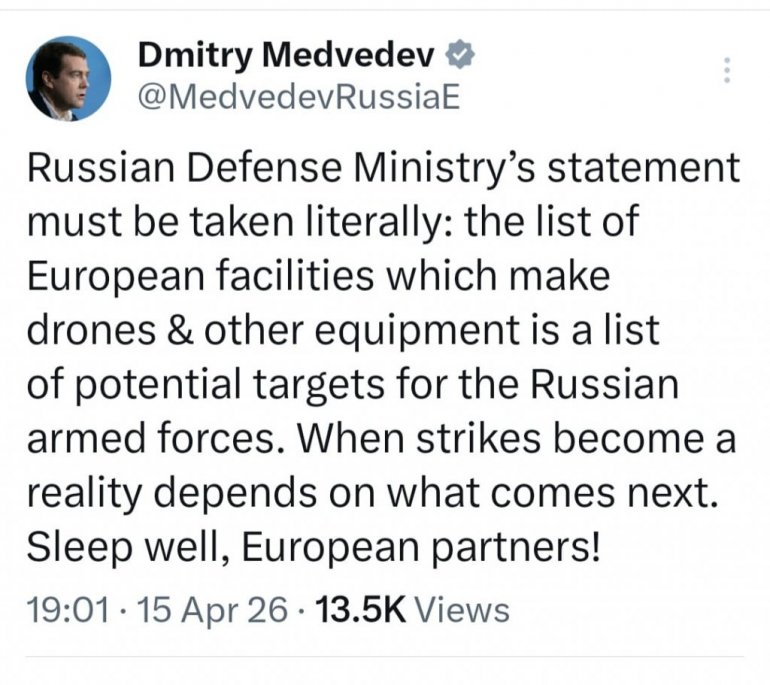 - Izjava ruskog Ministarstva odbrane mora se shvatiti doslovno: spisak evropskih objekata koji proizvode dronove i drugu opremu predstavlja spisak potencijalnih ciljeva za ruske oružane snage. Kada će napadi postati stvarnost zavisi od toga šta će se dalje desiti. Spavajte mirno, evropski partneri! - poručio je Medvedev.