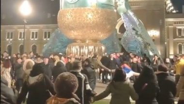 Čitav trg odjekivao je svima dobro poznatom numerom, a ljudi koji su se našli u ovom kolu nisu nosili zaštitne maske. Neki od njih imali su srpske zastave koje su se vijorile tokom ovog "skupa".
