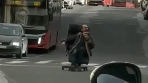 МУШКАРАЦ који се у канцеларијској столици креће коловозом снимљен је данас на Зеленом Венцу.