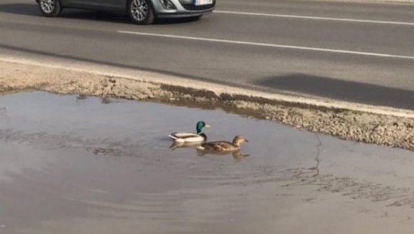 Овај двојац се брчкао и уживао на готово летњој температури не марећи ни за људе, ни за саобраћај.