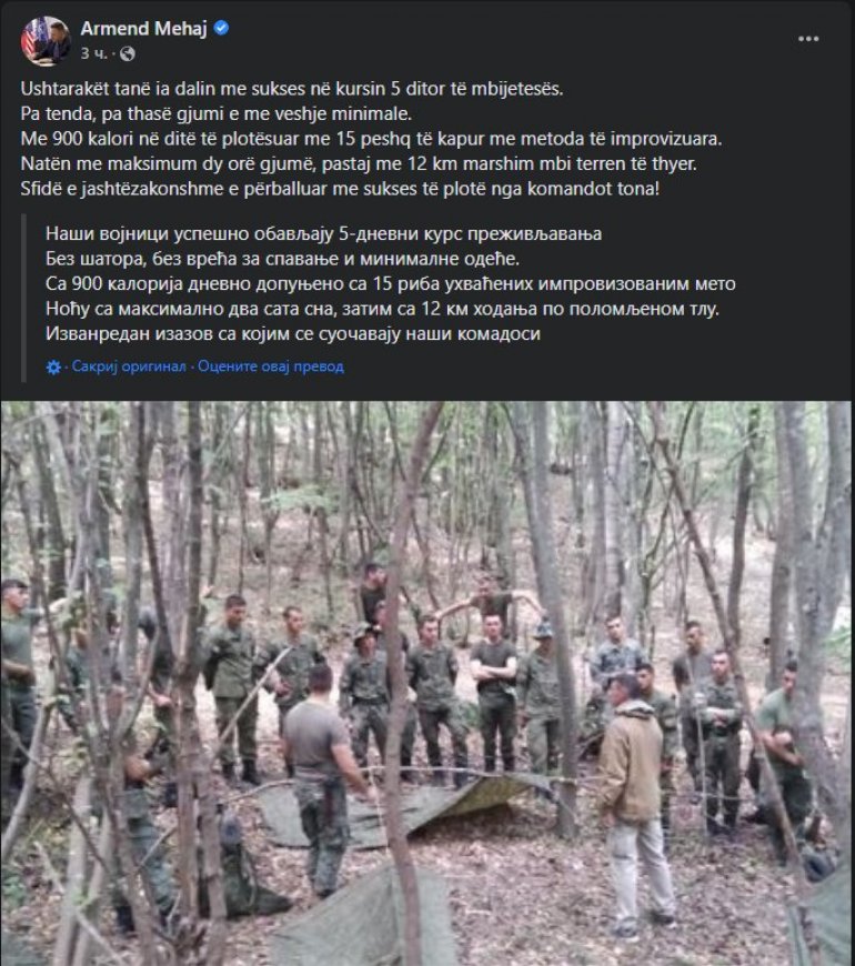- Наши војници успешно пролазе петодневни курс преживљавања. Без шатора, без врећа за спавање и са минималном одећом. Са 900 калорија дневно допуњених са 15 риба уловљених импровизованим методама - написао је Мехај на Фејсбуку.