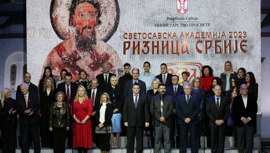 ХИМНОМ "Боже правде" вечерас је у Београду почела Светосавска академија 2023 "Ризница Србије", којој присуствују премијерка Србије Ана Брнабић, министар просвете Бранко Ружић, викар патријарха СПЦ, епископ новобрдски Иларион.