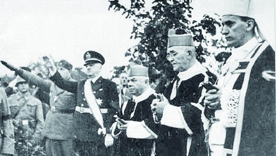 Надбискуп Алојзије Степинац (крајњи десно) и црквени дужносници са усташким и нацистичким официрима, Фото архива
