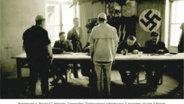 НА овој фотографији приказано је формирање добровољаца 21.брдске СС дивизије „Скенденберг“, а у позадини су застава Албаније,Немачке,СС-а, портрети Скендеберга на коњу и Хитлера.
