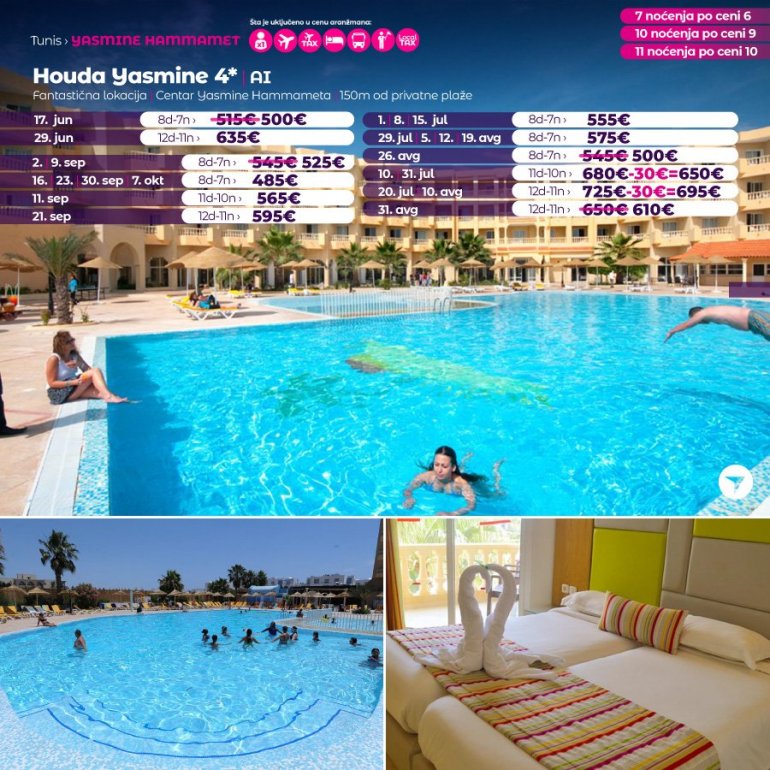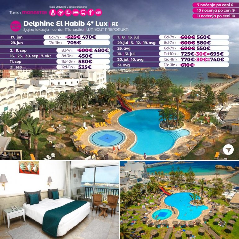 Искључиво са AirSerbia у Тунис! 7 ноћења по цени 6 ноћења / 10 ноћења по цени 9 ноћења / 11 ноћења по цени 10 ноћења. Издвајамо из понуде најтраженије хотеле за лето 2023: