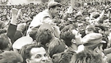 Милован Ђилас на раменима учесника протестног митинга у време Тршћанске кризе, Архив Југославије, Музеј Југославије, Документација „Новости“ и „Борбе“, Фејсбук, „Википедија“