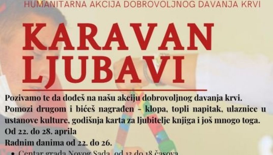 ОРГАНИЗАЦИЈА „На младима Србија остаје”, заједно са Фондацијом „Караван љубави”, уз подршку Института за трансфузију крви Србије, организује кампању добровољног давања крви под називом „Караван љубави” у периоду 22. 4. до 28. 4. у Новом Саду.