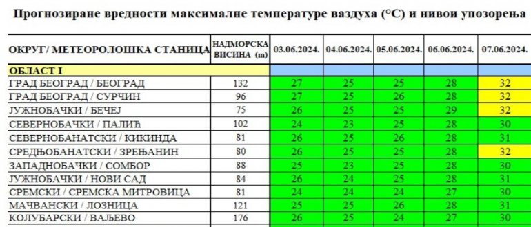 По табели коју је "Батут" објавио, односи се на период од 3. до 7. јуна, жути аларм се пали у Београду, Сурчину, Бечеју и Зрењанину, где је прогнозирана температура 32 степена.