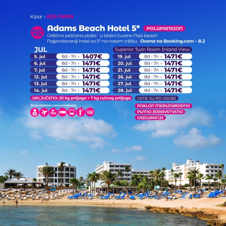 Хотел се налази у Аја Напи на самој Ниси плажи која је удаљена свега 2 минута хода. Хотел Адамс има свој део плаже на којем су бесплатне лежаљке и сунцобрани за госте хотела. У хотелу можете добити и пешкире за плажу.