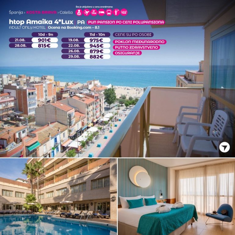 Хотел hTop Calella Palace налази се у регији Kоста Брава у месту Калела. Смештен је у близини једне од лепших пешчаних плажа и старог града. Плажа је удаљена 700 м од хотела. Дуж целе обале простире се пруга која води до Барселоне. Хотел такође нуди отворени базен, теретану, базен за децу, СПА центар, кидс клуб, мини водени парк за децу као и џакузи који се налази на последњем спрату хотела на великој тераси која нуди велики број лежаљки за сунчање.