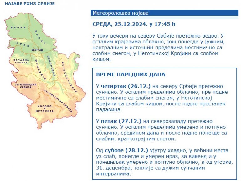 - У току вечери на северу Србије претежно ведро. У осталим крајевима облачно, још понегде у јужним, централним и источним пределима местимично са слабим снегом, у Неготинској Крајини са слабом кишом - стоји на сајту РХМЗ.