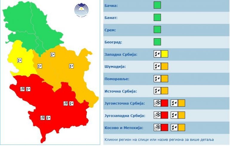 Црвени метео-аларм, који означава врло опасно време, на снази је у југоисточној и југозападној Србији и у АП Косово и Метохија, док је у Шумадији, Поморављу и у источној Србији на снази наранџасти метео-аларм, који означава опасно време.