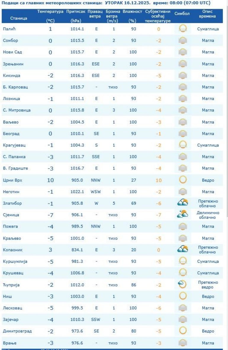 У ВОЈВОДИНИ, по котлинама и долинама река ујутру и пре подне магла и ниска облачност, која ће се у Бачкој, Срему и деловима западне и источне Србије задржати дуже током дана, док се у осталим пределима очекује мало до умерено облачно са сунчаним интервалима, а у планинским крајевима и претежно сунчано.