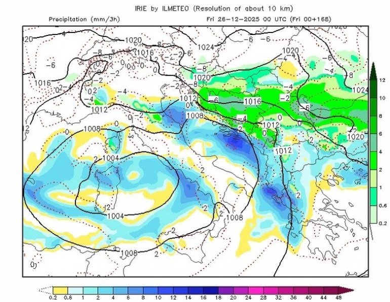 - Око 24.12. би се поље антициклона уз даље јачање требало ситуирати негде у област између запада Скандинавије и Велике Британије те би по источној периферији овог система почело повлачење хладног ваздуха са истока и североистока Русије. Од тачне снаге и положаја циклона над Медитераном ће у великој мери зависити и снага тог хладног продора као и његова брзина, али око 27.12. већина релевантних модела над Европом симулира праву зимску синоптику и снег би био могућ и у низијама - напомиње он.