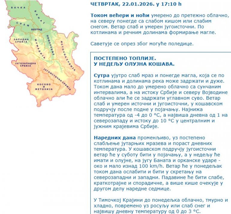 Сутра ујутро слаб мраз и понегде магла, која се по котлинама и долинама река може задржати и дуже. Током дана мало до умерено облачно са сунчаним интервалима, а на истоку Србије и северу Војводине облачно али ће се задржати углавном суво. Ветар слаб и умерен источни и југоисточни, у кошавском подручју после подне у појачању. Најнижа температура од -4 до 0 °С, а највиша дневна од 1 на северозападу и истоку до 10 °С у централним и јужним крајевима Србије.