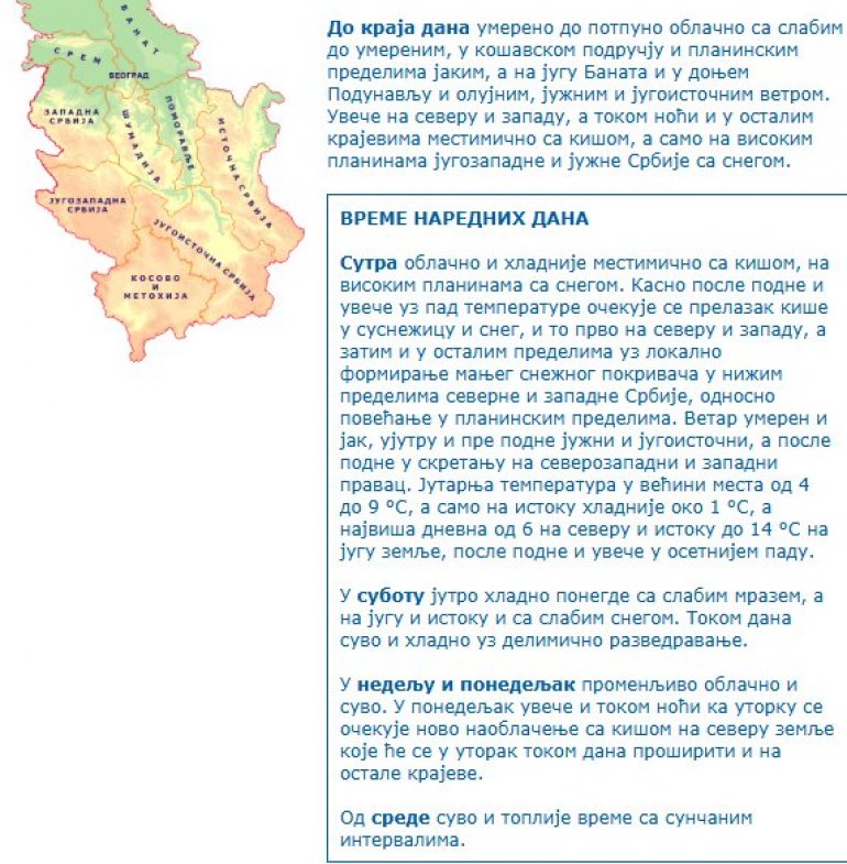 Сутра облачно и хладније местимично са кишом, на високим планинама са снегом. Касно после подне и увече уз пад температуре очекује се прелазак кише у суснежицу и снег, и то прво на северу и западу, а затим и у осталим пределима уз локално формирање мањег снежног покривача у нижим пределима северне и западне Србије, односно повећање у планинским пределима. Ветар умерен и јак, ујутру и пре подне јужни и југоисточни, а после подне у скретању на северозападни и западни правац. Јутарња температура у већини места од 4 до 9 °С, а само на истоку хладније око 1 °С, а највиша дневна од 6 на северу и истоку до 14 °С на југу земље, после подне и увече у осетнијем паду.