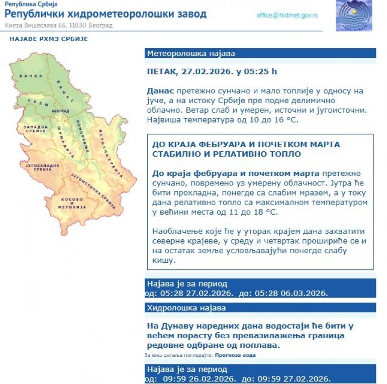 - Средином месеца постоји опција јачег захлађења, али је она за сада мало вероватна. Наредних дана време без промена. Јутра хладна уз углавном слаб, приземан мраз и ретку појаву магле. Током дана сунчано и релативно топло. Минимуми од -2 до три степена Целзијуса. Максимуми прво од седам до 17, а после 27. фебруара од 11 до 21 степен Целзијуса, дакле право рано пролеће.