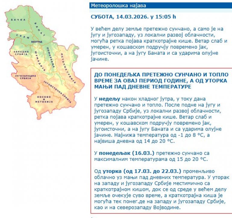 Од уторка (од 17.03. до 22.03.) променљиво облачно уз мањи пад дневних температура. У уторак на западу и југозападу Србије местимично са краткотрајном кишом, док се од среде у већем делу земље очекује суво време, а краткотрајна киша је могућа тек понег.де на западу и југозападу Србије, као и на северозападу Војводине. - стоји на сајту РХМЗ.