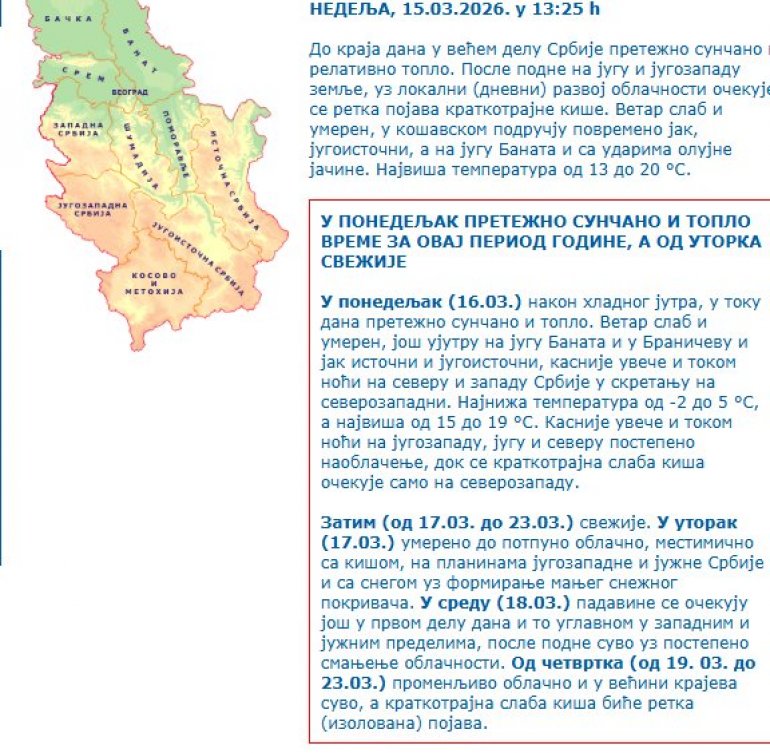 У понедељак (16.03.) након хладног јутра, у току дана претежно сунчано и топло. Ветар слаб и умерен, још ујутру на југу Баната и у Браничеву и јак источни и југоисточни, касније увече и током ноћи на северу и западу Србије у скретању на северозападни. Најнижа температура од -2 до 5 °С, а највиша од 15 до 19 °С. Касније увече и током ноћи на југозападу, југу и северу постепено наоблачење, док се краткотрајна слаба киша очекује само на северозападу.