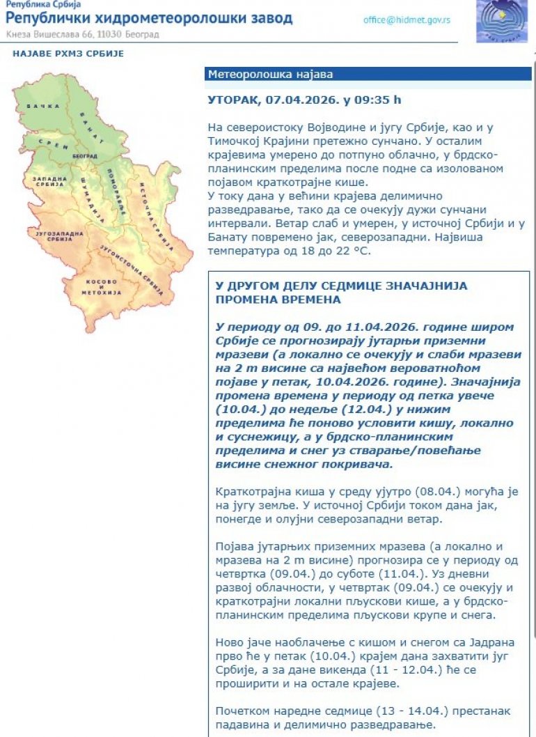У периоду од 09. до 11.04.2026. године широм Србије се прогнозирају јутарњи приземни мразеви (а локално се очекују и слаби мразеви на 2 m висине са највећом вероватноћом појаве у петак, 10.04.2026. године). Значајнија промена времена у периоду од петка увече (10.04.) до недеље (12.04.) у нижим пределима ће поново условити кишу, локално и суснежицу, а у брдско-планинским пределима и снег уз стварање/повећање висине снежног покривача.