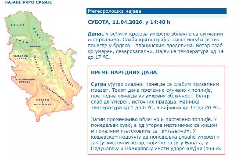 - Данас у већини крајева умерено облачно са сунчаним интервалима. Слаба краткотрајна киша могућа је тек понегде у брдско - планинским пределима. Ветар слаб до умерен, северозападни. Највиша температура од 14 до 17 °С.
