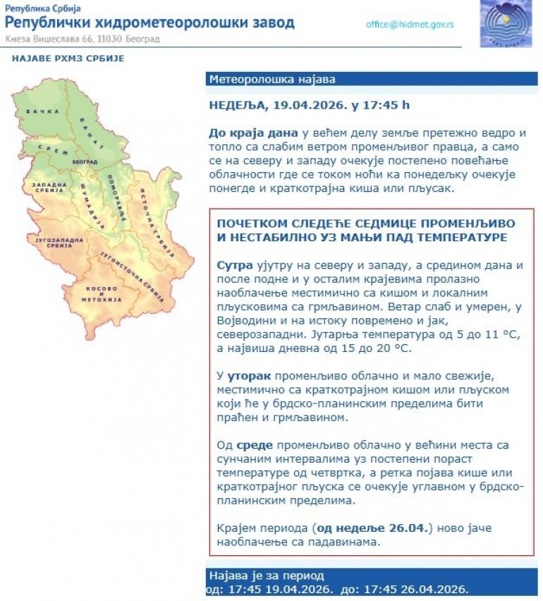 Сутра ујутру на северу и западу, а средином дана и после подне и у осталим крајевима пролазно наоблачење местимично са кишом и локалним пљусковима са грмљавином. Ветар слаб и умерен, у Војводини и на истоку повремено и јак, северозападни. Јутарња температура од 5 до 11 °С, а највиша дневна од 15 до 20 °С.