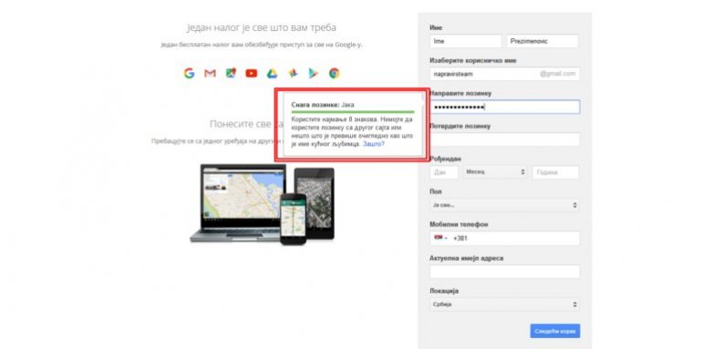 Када изаберете опцију "отворите налог" појавиће се прозор у који треба да упишете личне податке, име и презиме, корисничко име и лозинку. Неопходно је да попуните све понуђене опције. За шифру изаберите комбинацију која ће садржати велика и мала слова, као и бројеве.