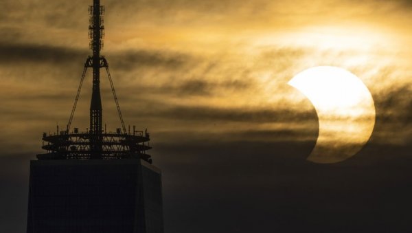 -Месец је почео да се креће између Земље и Сунца тек јутрос али се већ потпуно јасно види пословни утицај потпуног помрачења Сунца, које почиње изнад Тихог океана, пресеца пут преко Северне Америке и завршава у Атлантику, наводи Економист.