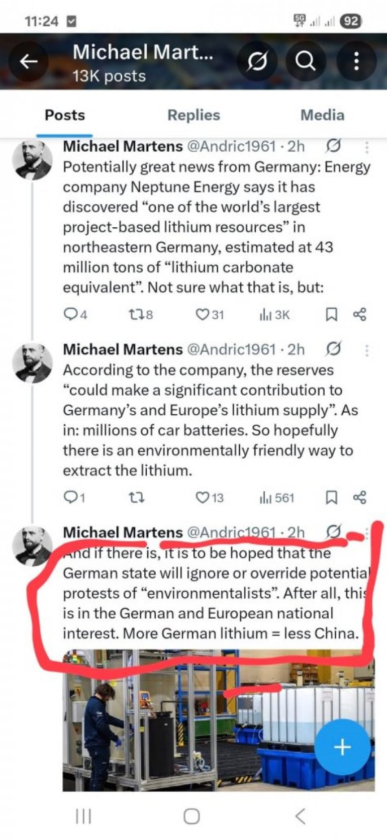 ПОЗНАТИ немачки новинар и писац Михаел Мартенс огласио се на свом Твитер налогу поводом најновијег открића великих налазишта литијума у Немачкој.