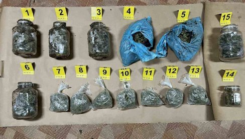 Претресом домаћинства осумњиченог, полиција је пронашла више тегли и кеса са око 3,8 килограма марихуане која је, како се сумња, била намењена даљој продаји.