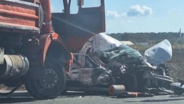 Сударили су се камион и путнички аутомобил који је након судара потпуно смрскан.