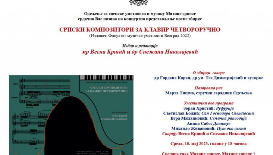 О збирци ће говорити др Гордана Каран и др Теа Димитријевић и ауторке, које ће свирати дела Зорана Христића ("Руфурија"), Светислава Божића ("Сан Господара Светлости"), Вере Миланковић ("Сењачка рапсодија"), Анице Сабо ("Диантус") и Михаила Живановића ("Пут око света"). Слушаоци ће директан пренос концертног представљања збирке моћи да прате на "Јутјуб" каналу Матице српске.