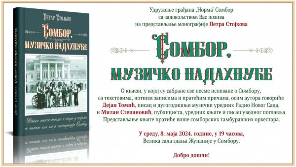 Књига ће бити представљена у среду,8.маја у Великој сали здања сомборске Жупаније (19.00).Осим аутора Стојкова,о овом значајном подухвату за музичку историју Сомбора,говориће Дејан Томић,писац и некадашњи дугогодишњи музички уредник Радио Новог Сада и Милан Степановић,публициста, уредник овог издања и аутор уводног поглавља.