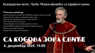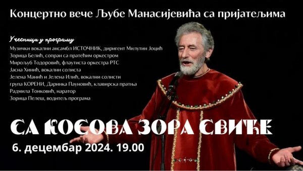 КОНЦЕРТНО вече Љубе Манасијевића, под називом "Са Косова зора свиће", одржаће се у петак, 6. децембра, на сцени Руског дома у Београду.
